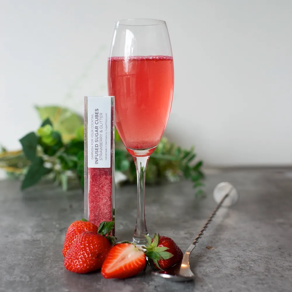 Rør med 7 sugar cubes med dyb smag af solmodne jordbær og pynt med pink glitter. helt perfekt til at lave en Strawberry Fizz cocktail med.